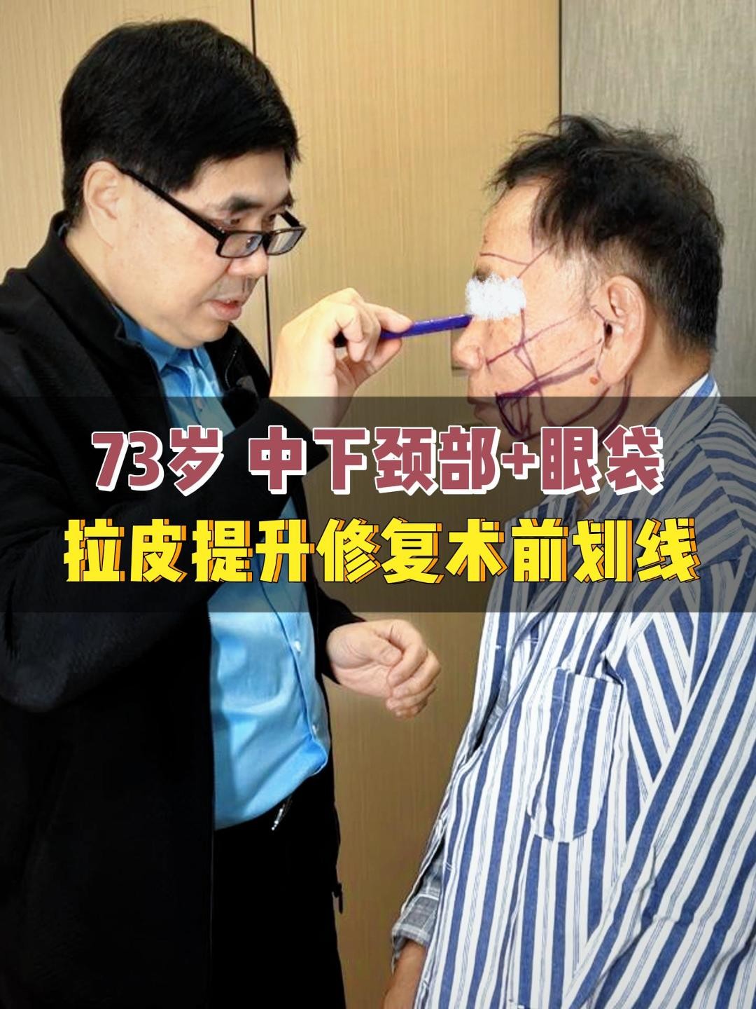 73岁,中下颈部+眼袋,拉皮提升修复术前划线!