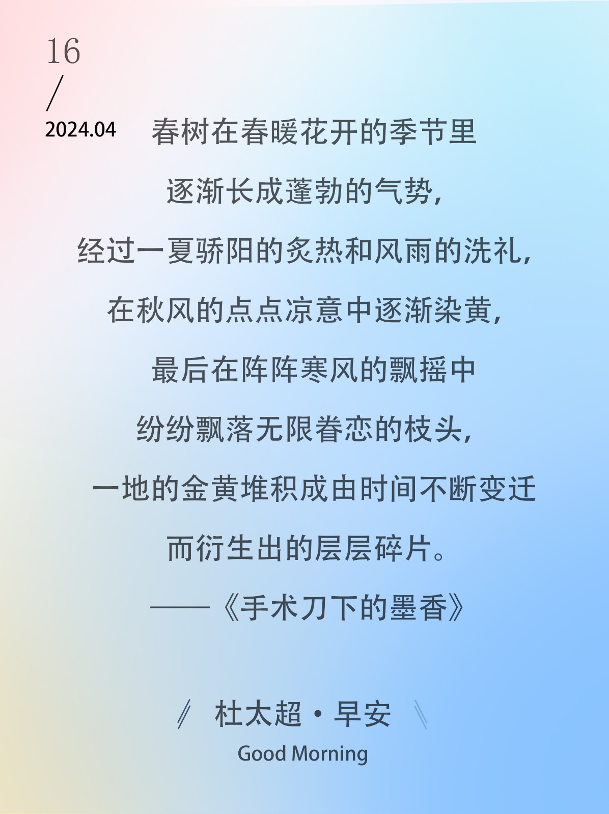 春树在春暖花开的季节里逐渐长成蓬勃的气势,经过一夏骄阳的炙热和风雨的洗礼,在秋风的点点凉意中逐渐染黄,最后在阵阵寒风的飘摇中纷纷飘...