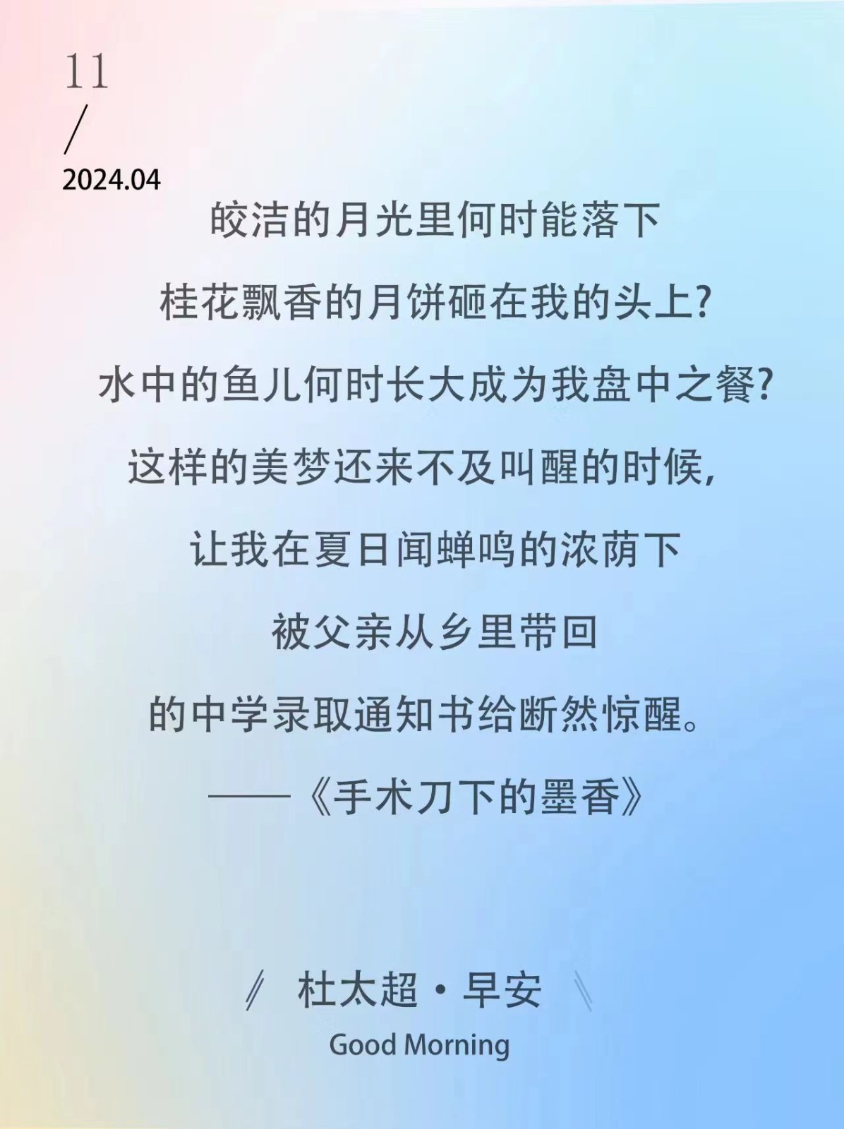 皎洁的月光里何时能落下,桂花飘香的月饼砸在我的头上?水中的鱼儿何时长大成为我盘中之餐?这样的美梦还来不及叫醒的时候,让我在夏日闻蝉鸣...