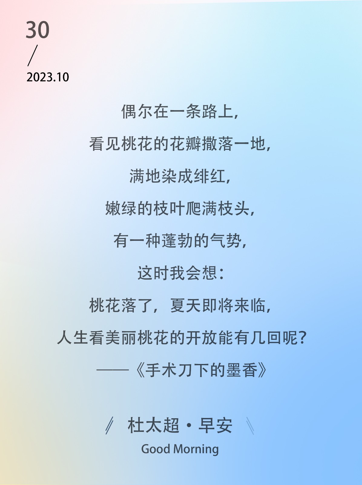 偶尔在一条路上,看见桃花的花瓣撒落一地,满地染成绯红,嫩绿的枝叶爬满枝头,有一种蓬勃的气势,这时我会想:桃花落了,夏天即将来临,人...