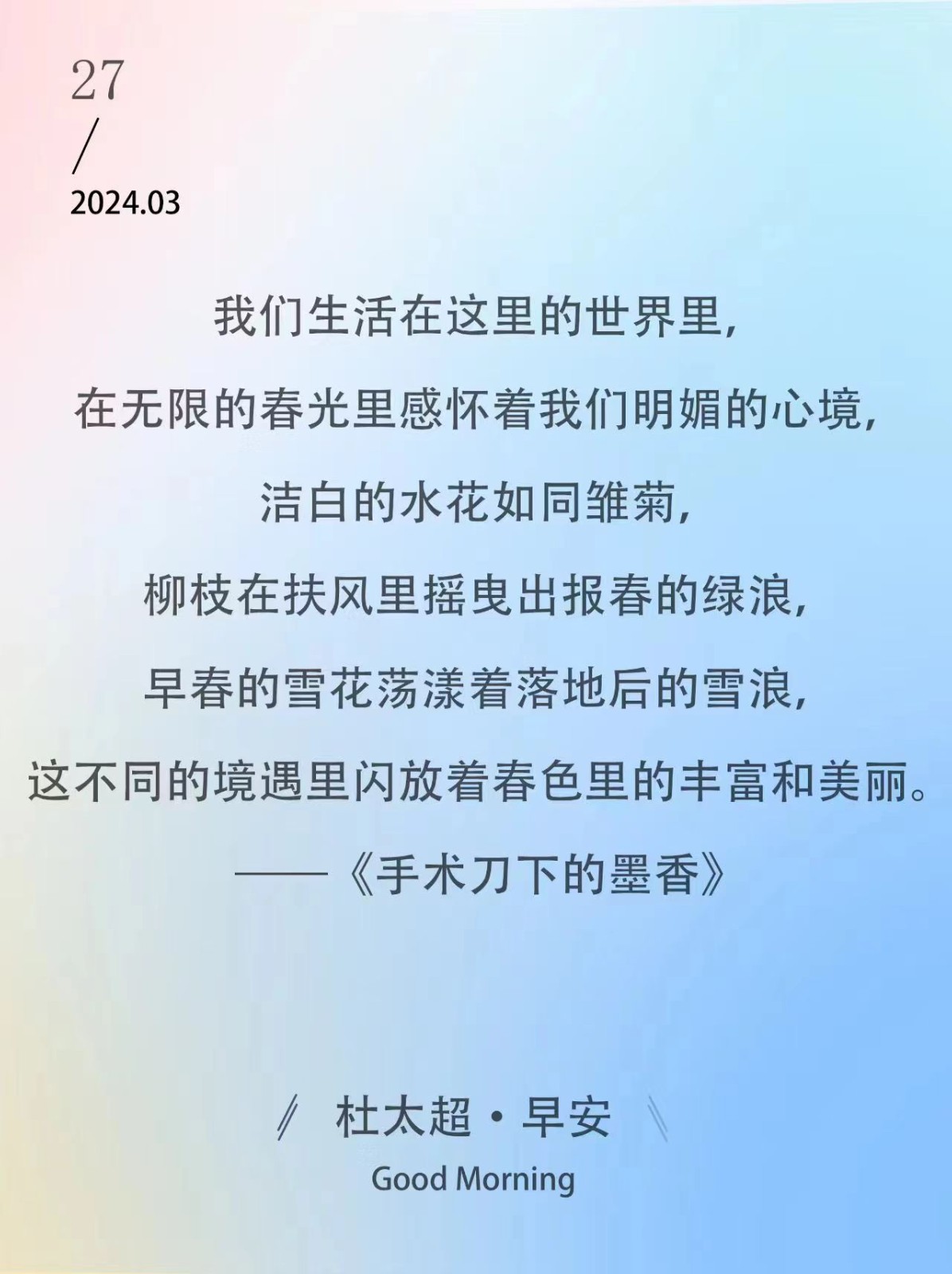 我们生活在这里的世界里,在无限的春光里感怀着我们明媚的心境,洁白的水花如同雏菊,柳枝在扶风里摇曳出报春的绿浪,早春的雪花荡漾着落地...