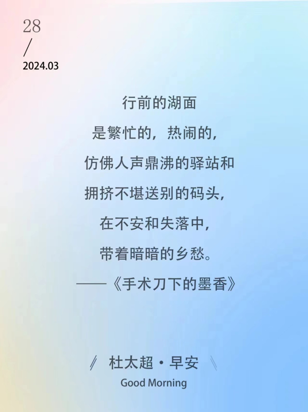 行前的湖面是繁忙的,热闹的,仿佛人声鼎沸的驿站和拥挤不堪送别的码头,在不安和失落中,带着暗暗的乡愁。——《手术刀下的墨香》