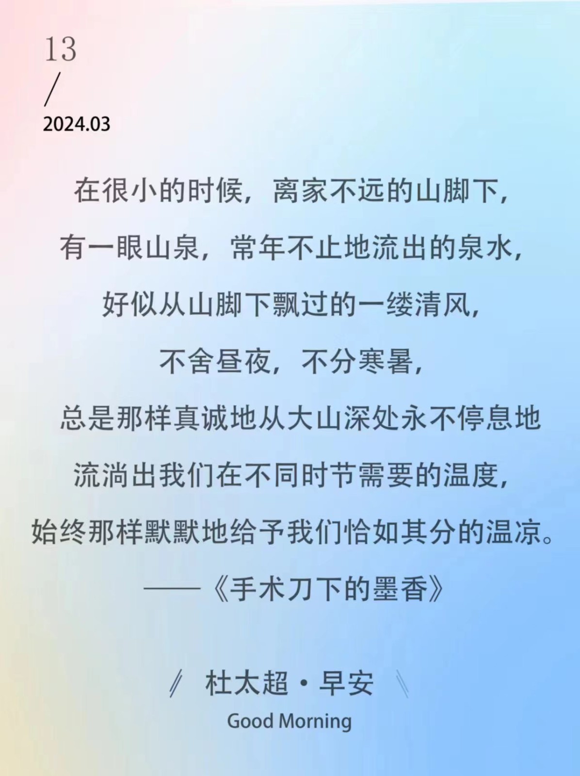 在很小的时候,离家不远的山脚下,有一眼山泉,常年不止地流出汩汩清澈的泉水,好似从山脚下飘过的一缕清风,不舍昼夜,不分寒暑,总是那样...