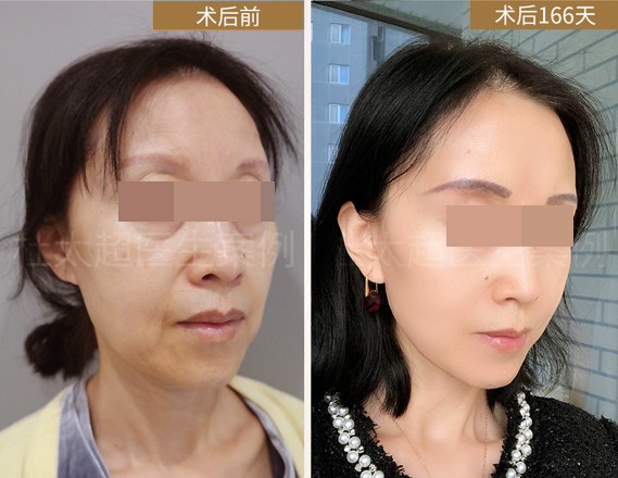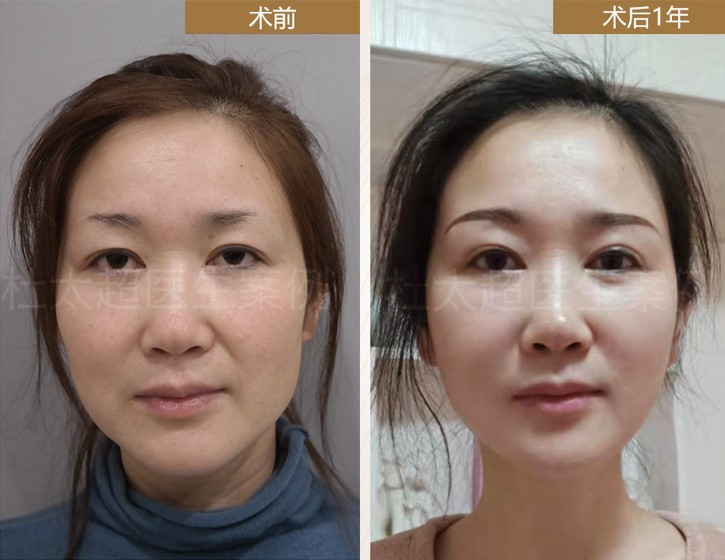 39岁,#caw小切口面部提升 +提眉术 ,术前双眼皮松弛造成眼神无力,下颌线脂肪堆积,术后1年双眼皮变有神,下颌线也提升,整体轮廓上扬紧致。