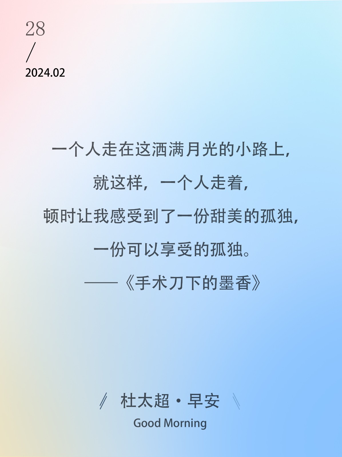 一个人走在这洒满月光的小路上,就这样,一个人走着,顿时让我感受到了一份甜美的孤独,一份可以享受的孤独。——《手术刀下的墨香》