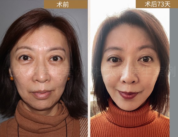 48岁,#caw小切口面部提升 +提眉术,术前双眼皮松弛造成的双眼皮形态不佳,下颌脂肪堆积,术后73天双眼皮形态流畅,下颌线清晰,整体面部...