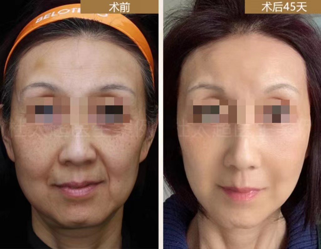55岁,#caw小切口面部提升 +钻石精雕+眼袋,术前眼袋明显,法令纹深,下颌线脂肪堆积,术后45天,祛除眼袋,淡化法令纹,下颌线提升,整体...