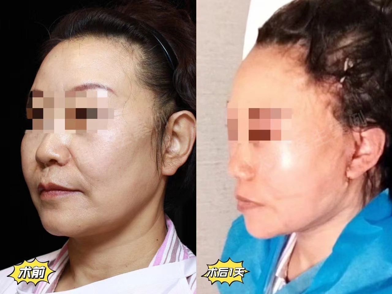caw小切口面部提升手术做的耳前连续切口设计,提升范围辐射整个中下面颈部图为术后1天效果对比,紧致度、饱满度、去皱效果都非常明显,求美...