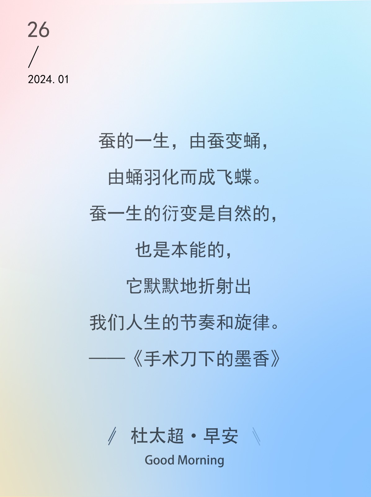 蚕的一生,由蚕变蛹,由蛹羽化而成飞蝶。蚕一生的衍变是自然的,也是本能的,它默默地折射出我们人生的节奏和旋律。——《手术刀下的墨香》