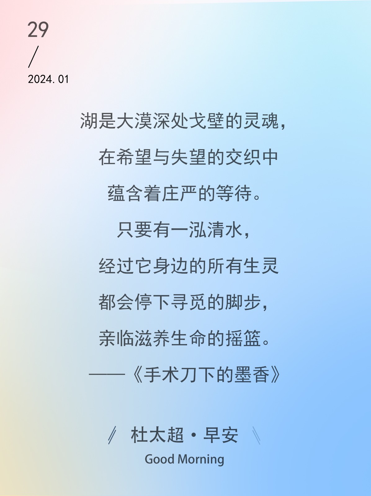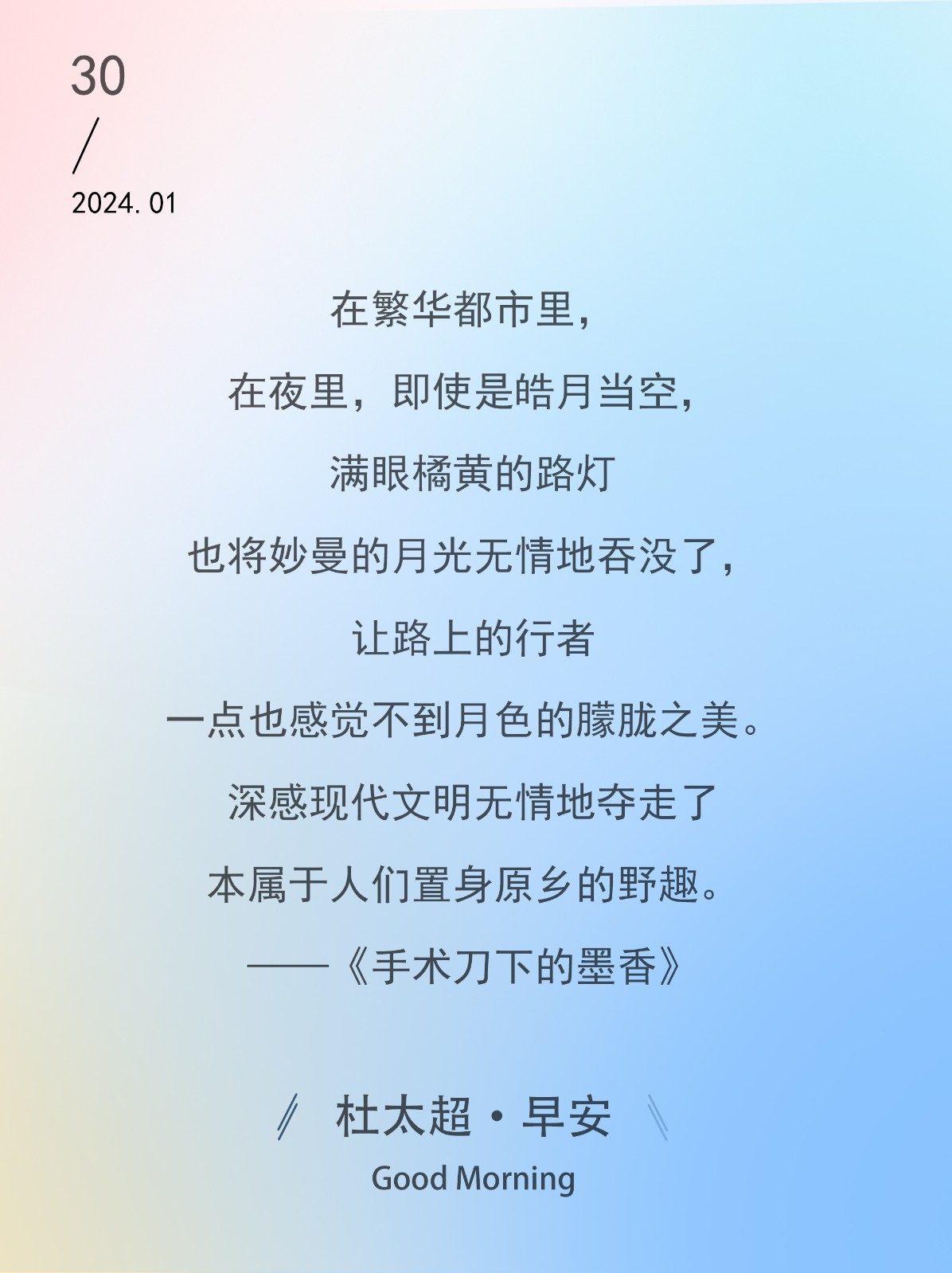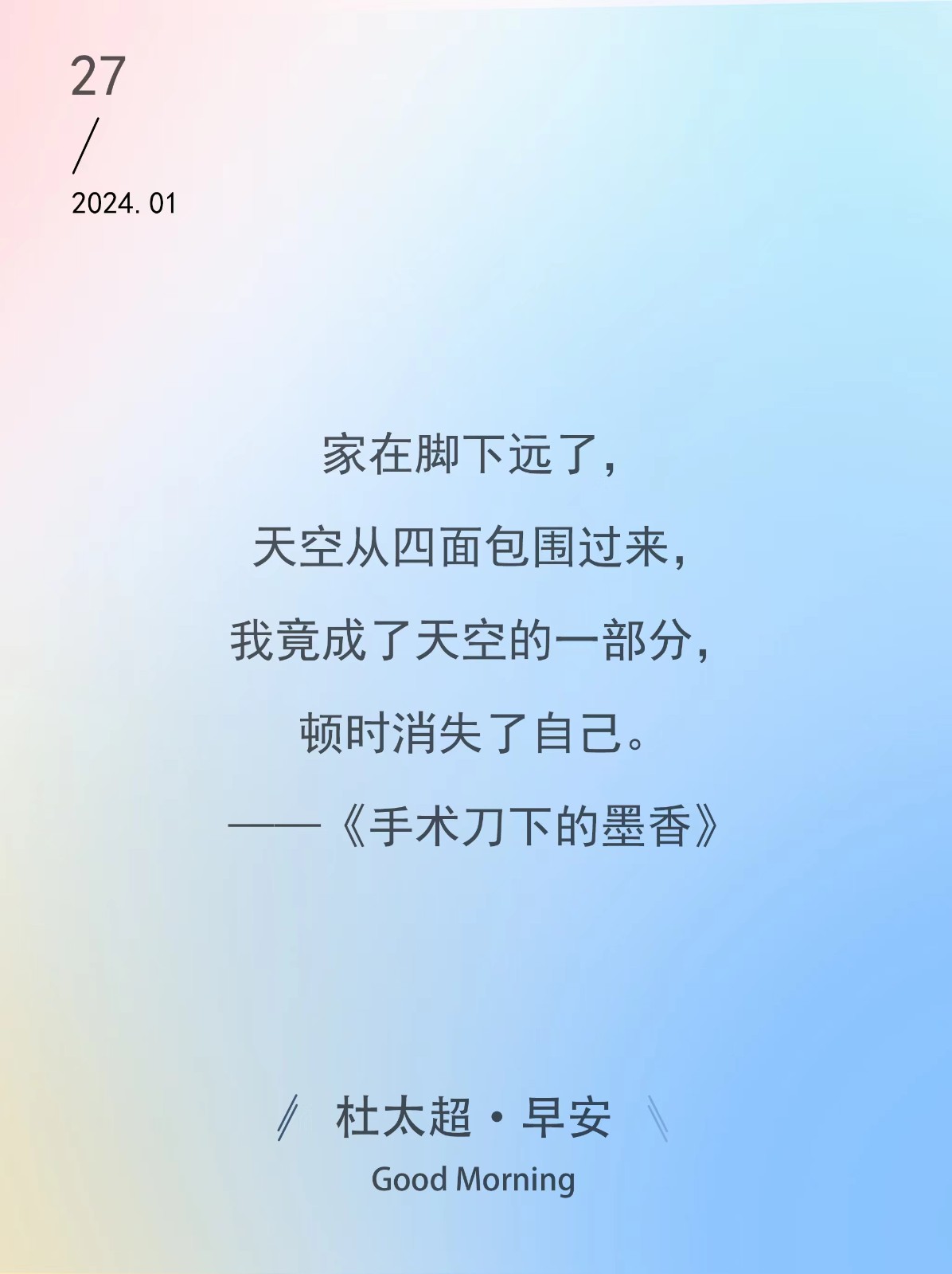 家在脚下远了,天空从四面包围过来,我竟成了天空的一部分,顿时消失了自己。——《手术刀下的墨香》