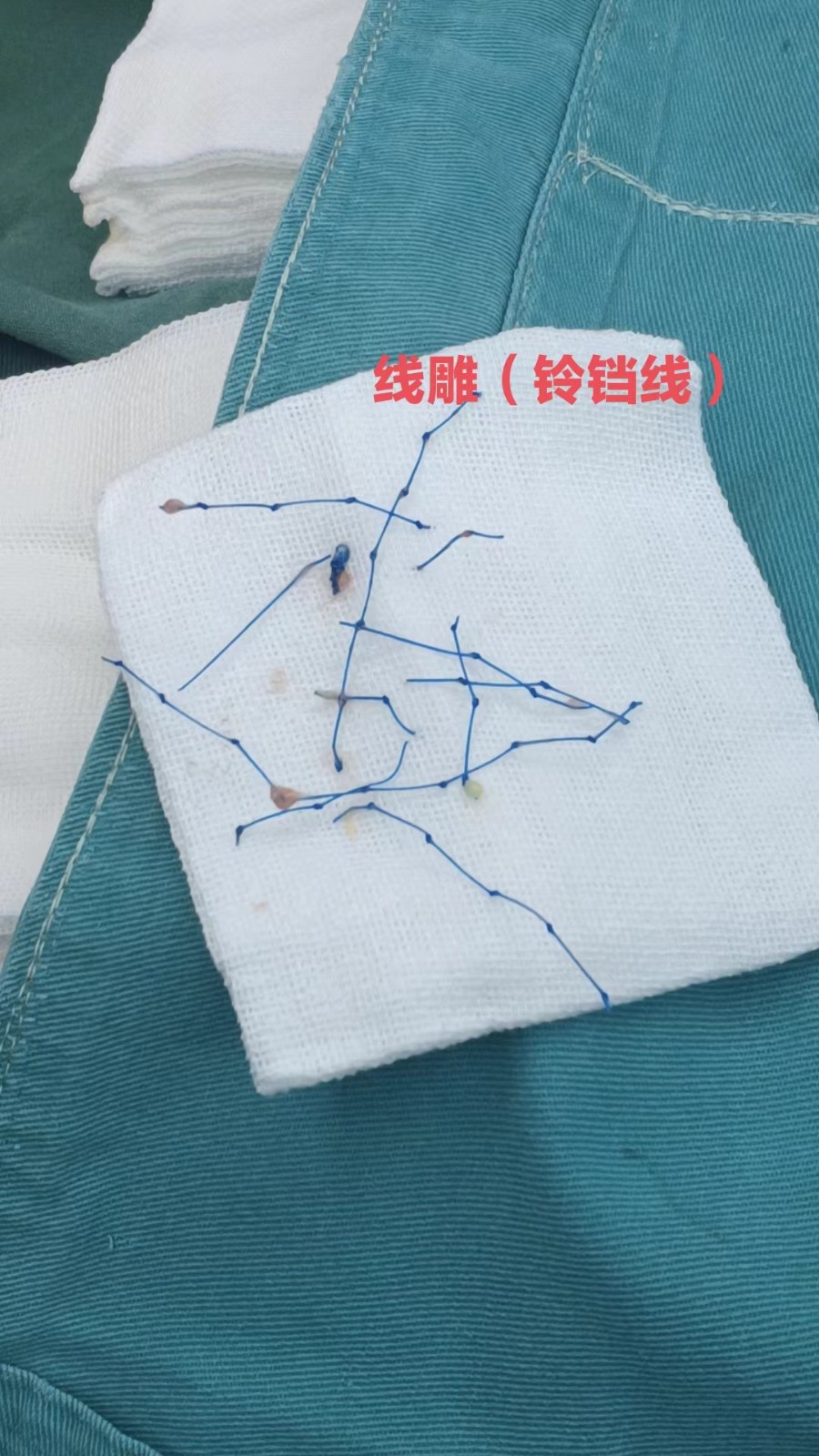 55岁,5年前做的线雕(铃铛线),自述只维持了3-6个月,最终下定决心,做了我们的caw小切口面部提升手术,下图为取出的线,手术进行中,期待~