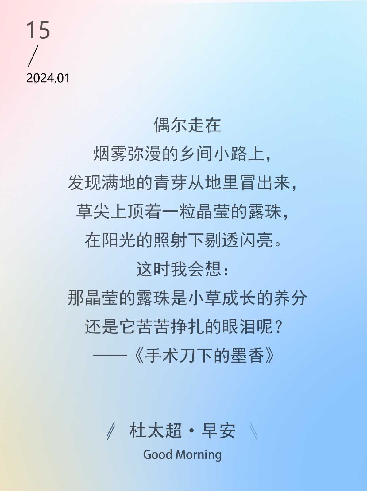 偶尔走在烟雾弥漫的乡间小路上,发现满地的青芽从地里冒出来,草尖上顶着一粒晶莹的露珠,在阳光的照射下剔透闪亮。这时我会想:那晶莹的露...