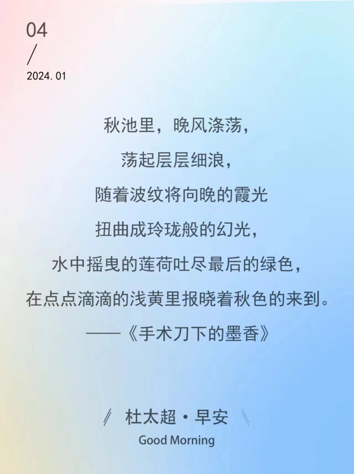 秋池里,晚风涤荡,荡起层层细浪,随着波纹将向晚的霞光扭曲成玲珑般的幻光,水中摇曳的莲荷吐尽最后的绿色,在点点滴滴的浅黄里报晓着秋色...