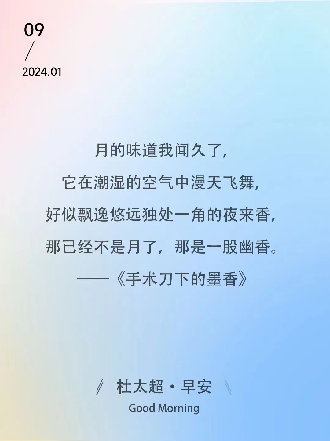 月的味道我闻久了,它在潮湿的空气中漫天飞舞,好似飘逸悠远独处一角的夜来香,那已经不是月了,那是一股幽香。——《手术刀下的墨香》