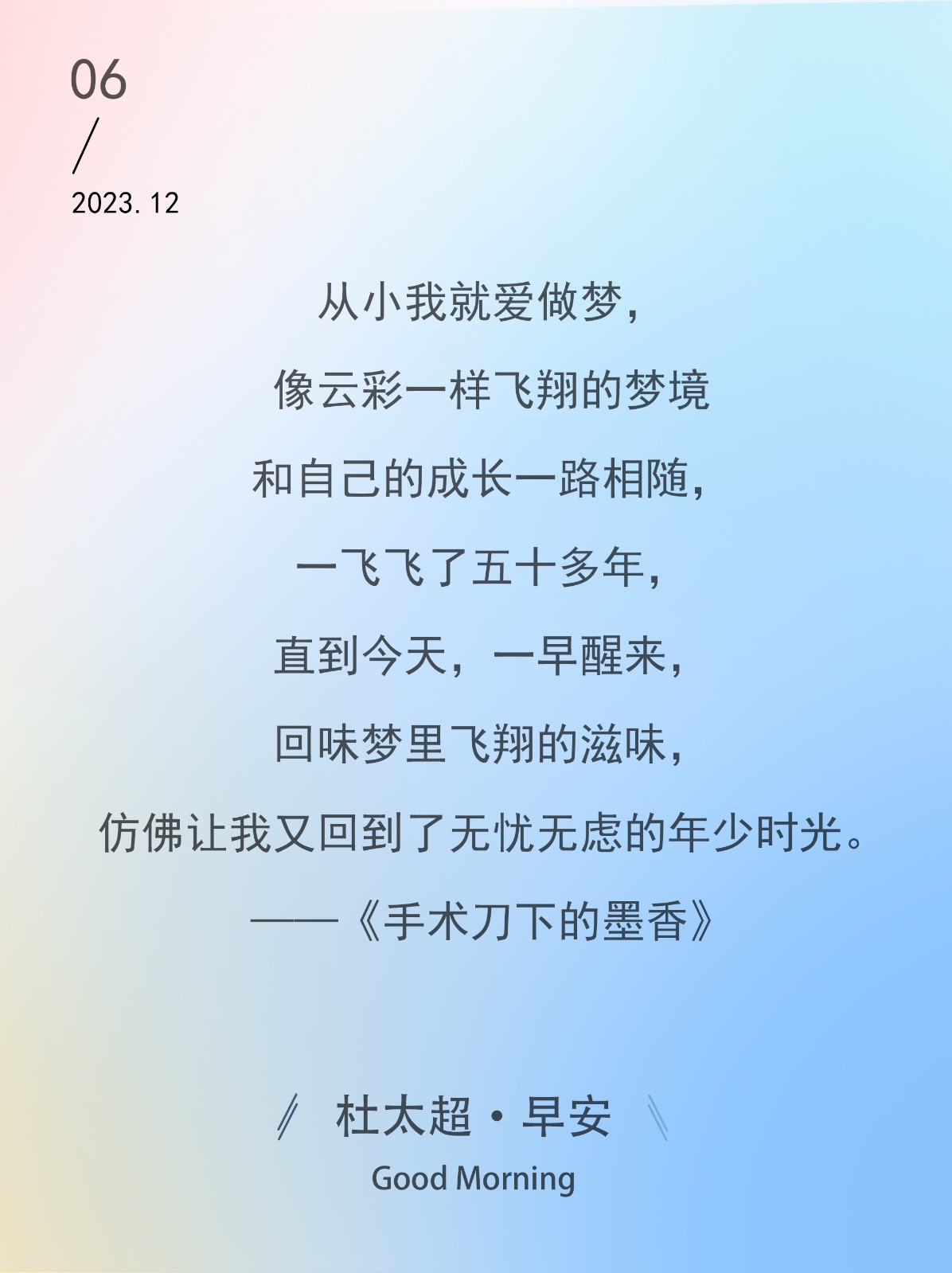 从小我就爱做梦,像云彩一样飞翔的梦境和自己的成长一路相随,一飞飞了五十多年,直到今天,一早醒来,回味梦里飞翔的滋味,仿佛让我又回到...