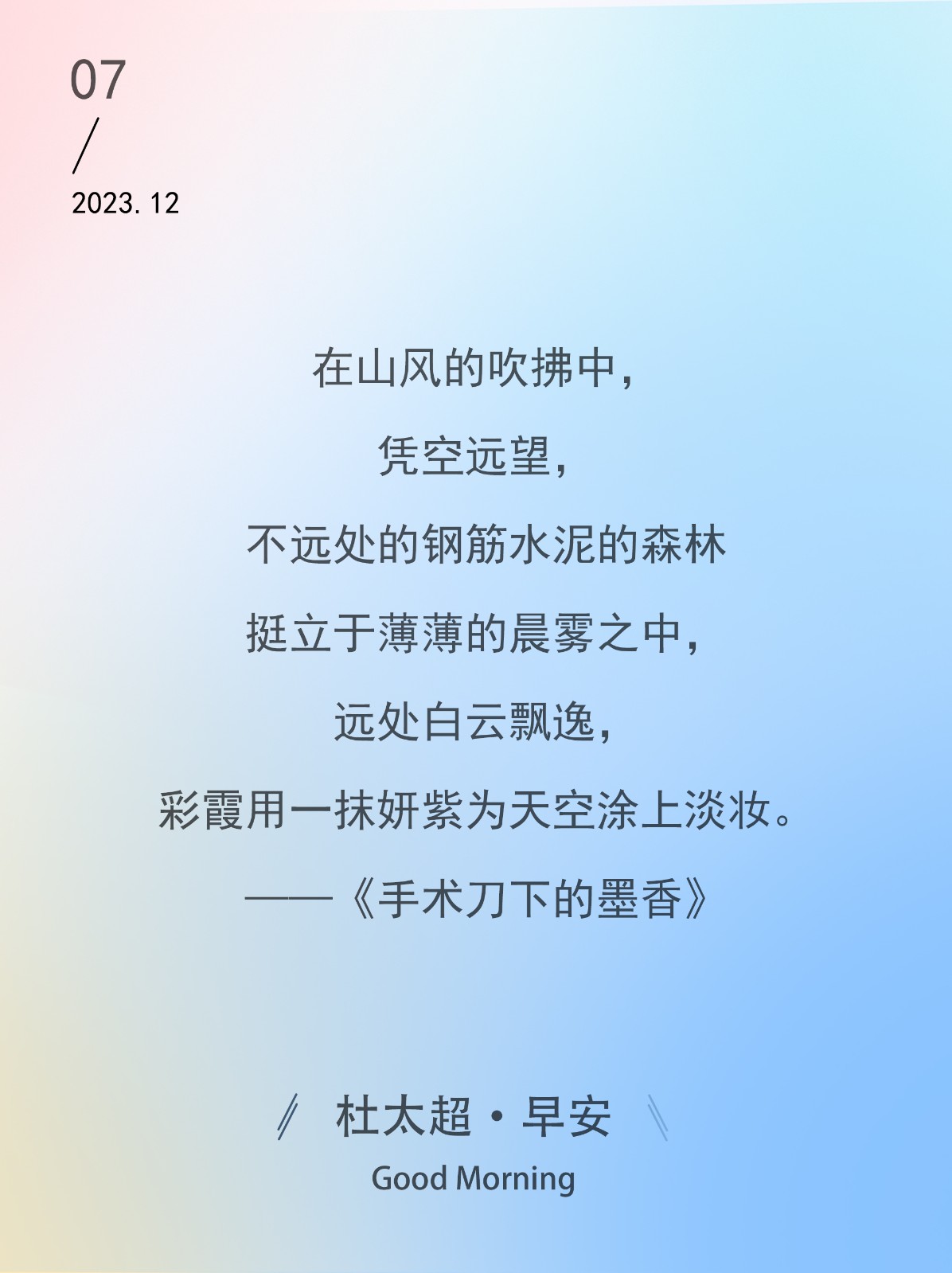 在山风的吹拂中,凭空远望,不远处的钢筋水泥的森林挺立于薄薄的晨雾之中,远处白云飘逸,彩霞用一抹妍紫为天空涂上淡妆。——《手术刀下的...