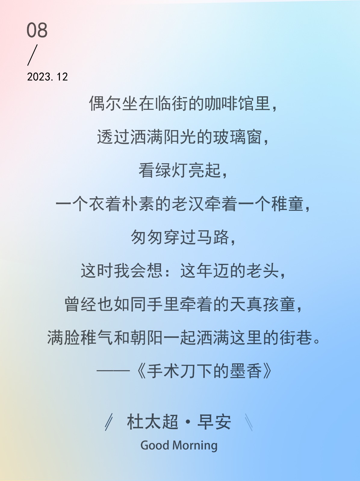 偶尔坐在临街的咖啡馆里,透过洒满阳光的玻璃窗,看绿灯亮起,一个衣着朴素的老汉牵着一个稚童,匆匆穿过马路,这时我会想:这年迈的老头,...