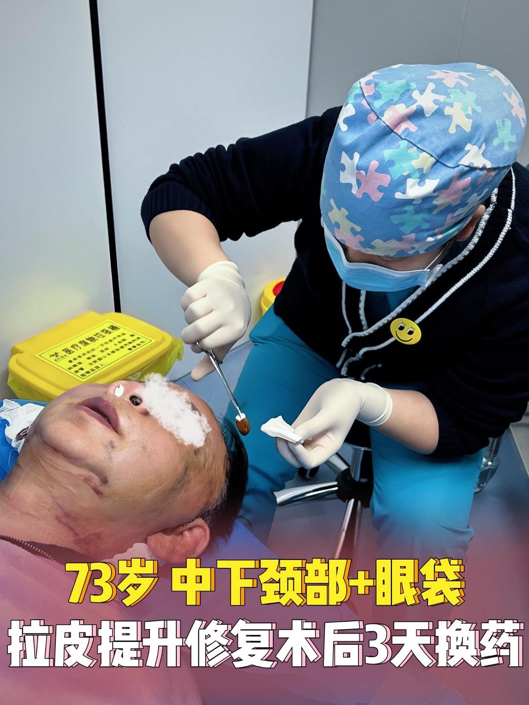 73岁,中下颈部+眼袋,拉皮提升修复术后3天换药!
