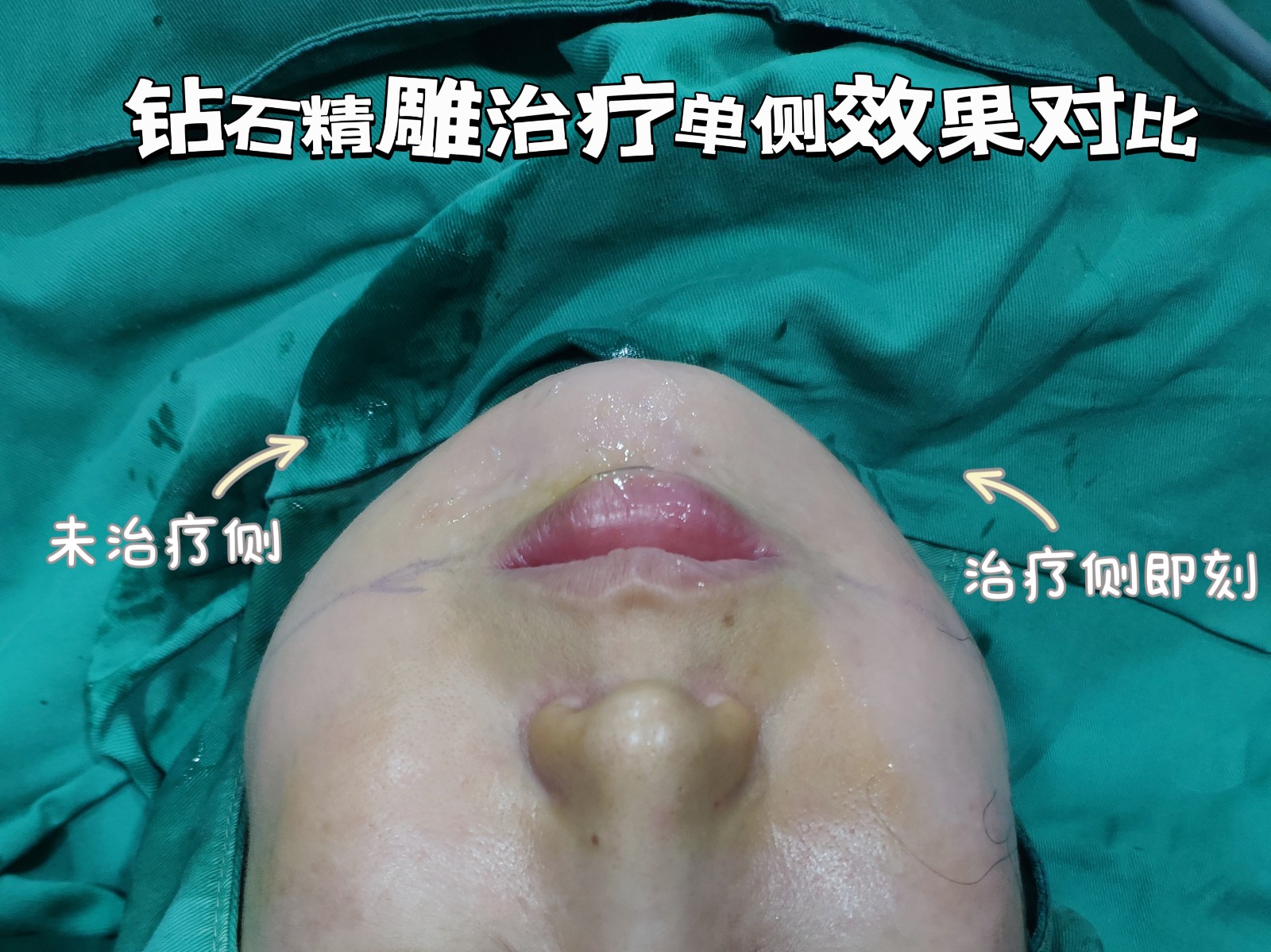 #钻石精雕# 治疗即刻效果分享 钻石精雕治疗前会在面部注射肿胀液,面部会有轻度膨起。然后通过钻石精雕的治疗探头,正极置于皮下,负极置...