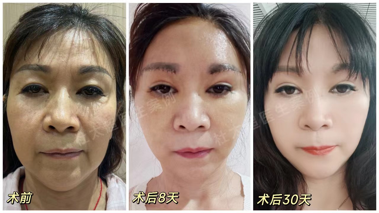 caw小切口面部提升术后效果对比,术前额纹、川字纹、法令纹、口角纹明显,面部轮廓松弛,术后面部紧致,面部纹路淡化消失。