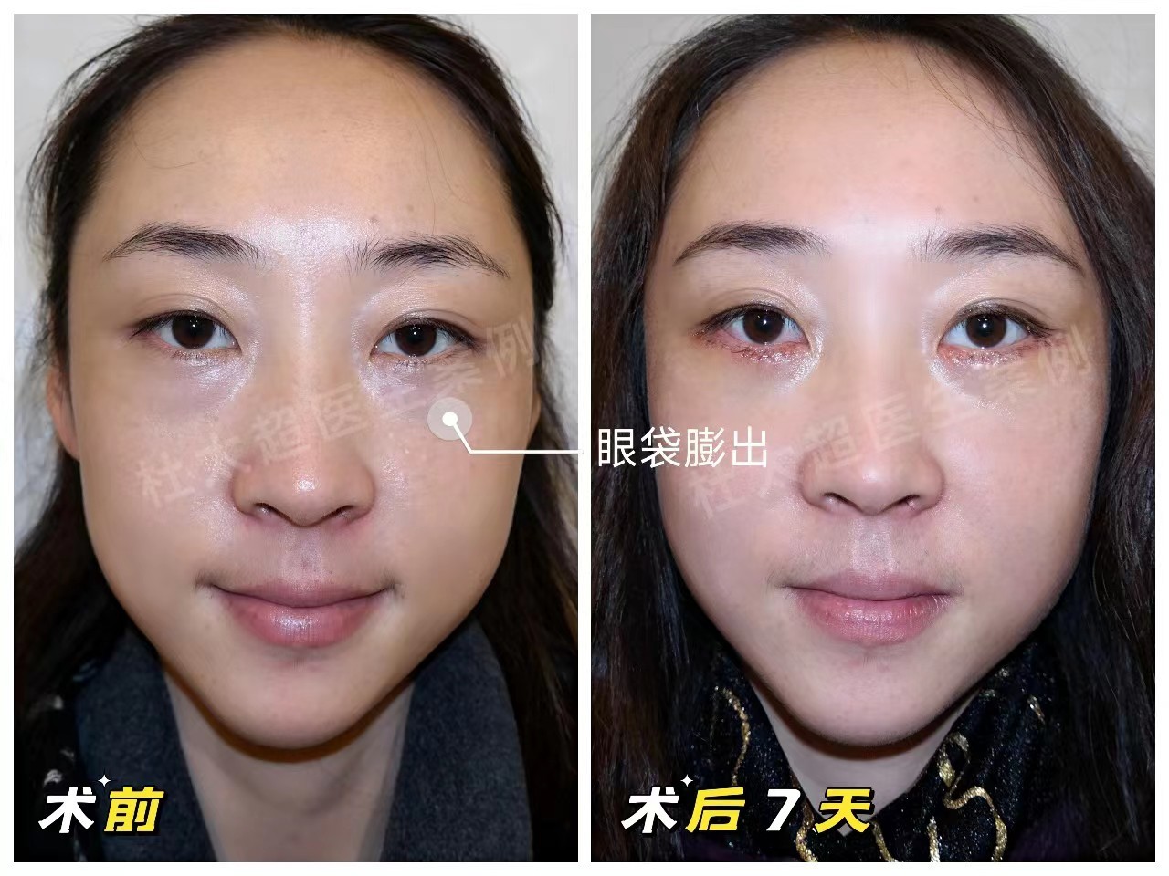 脂肪膨出型眼袋,多发生于中青年人群~常因作息失调、长期熬夜而产生~经下眼睑缘2mm处做切口,进行眶隔脂肪释放,去除部分脂肪团后精细缝合...