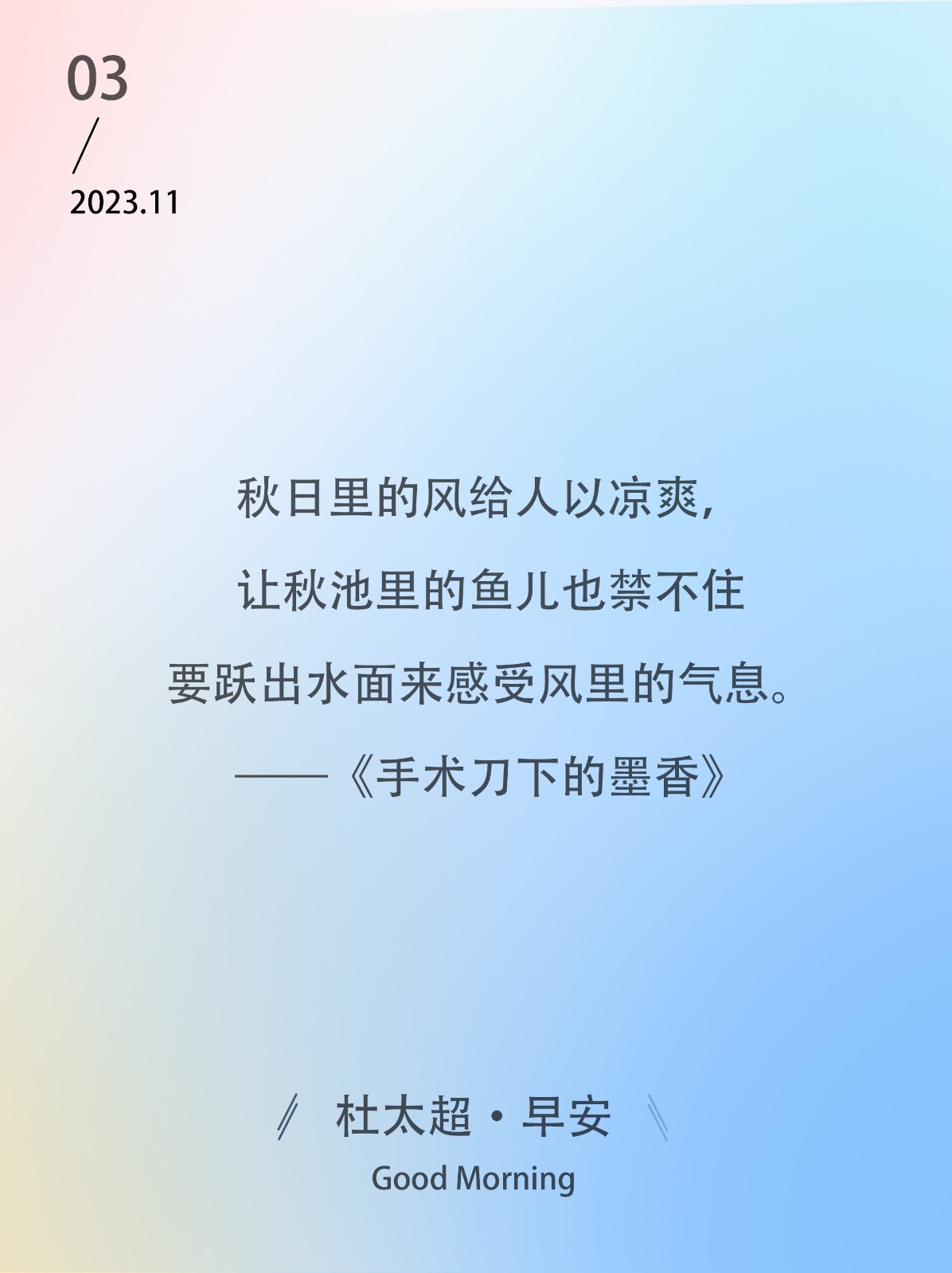 秋日里的风给人以凉爽,让秋池里的鱼儿也禁不住要跃出水面来感受风里的气息。——《手术刀下的墨香》