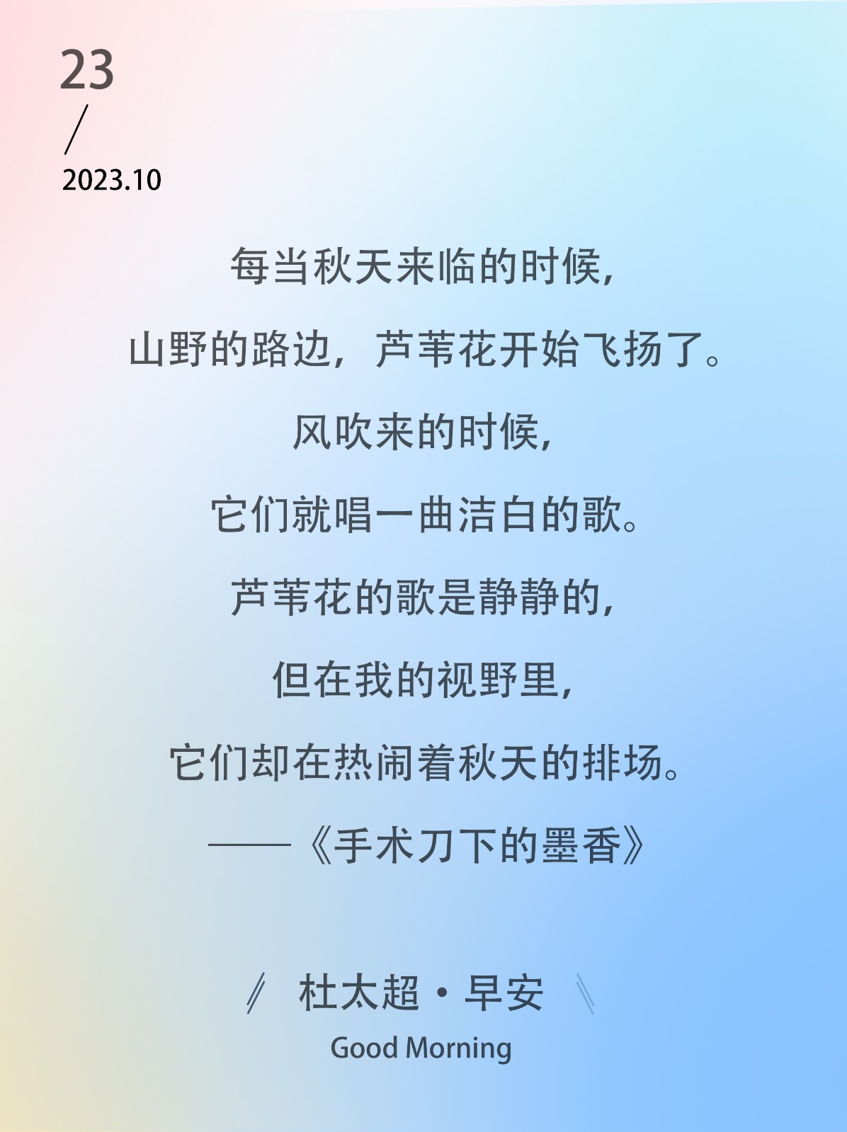 每当秋天来临的时候,山野的路边,芦苇花开始飞扬了。风吹来的时候,它们就唱一曲洁白的歌。芦苇花的歌是静静的,但在我的视野里,它们却在...