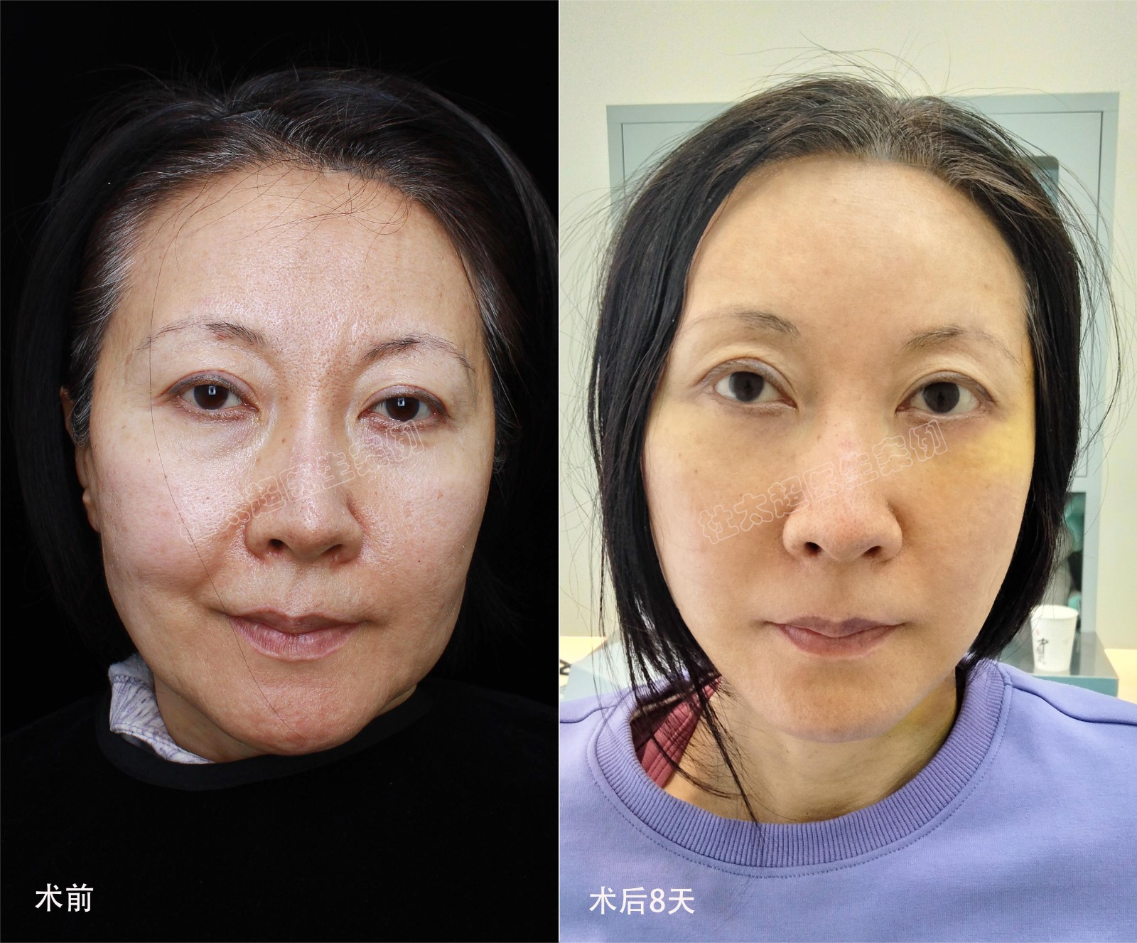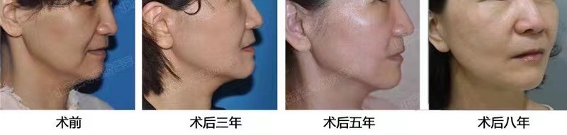 caw小切口拉皮提升改善中下面部法令纹、面颊松弛凹陷、下颌松弛。术前、术后三年、术后五年、术后八年对比。