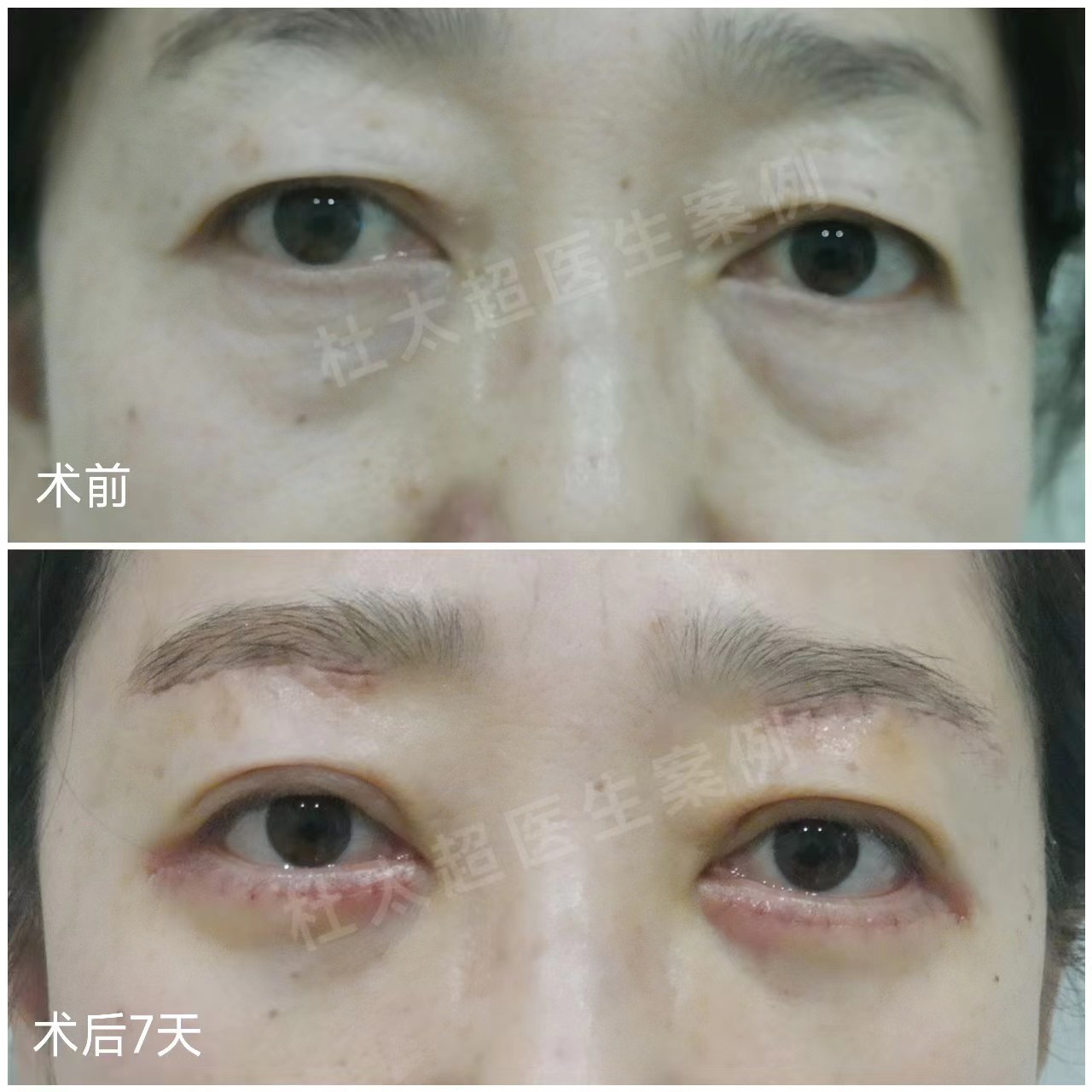 48岁的求美者,因为眼周老化问题经常被问50几岁了!伤心的找到我们求助,帮她设计了做切眉术+外路去眼袋,术后7天恢复效果如图,眼皮松弛下...