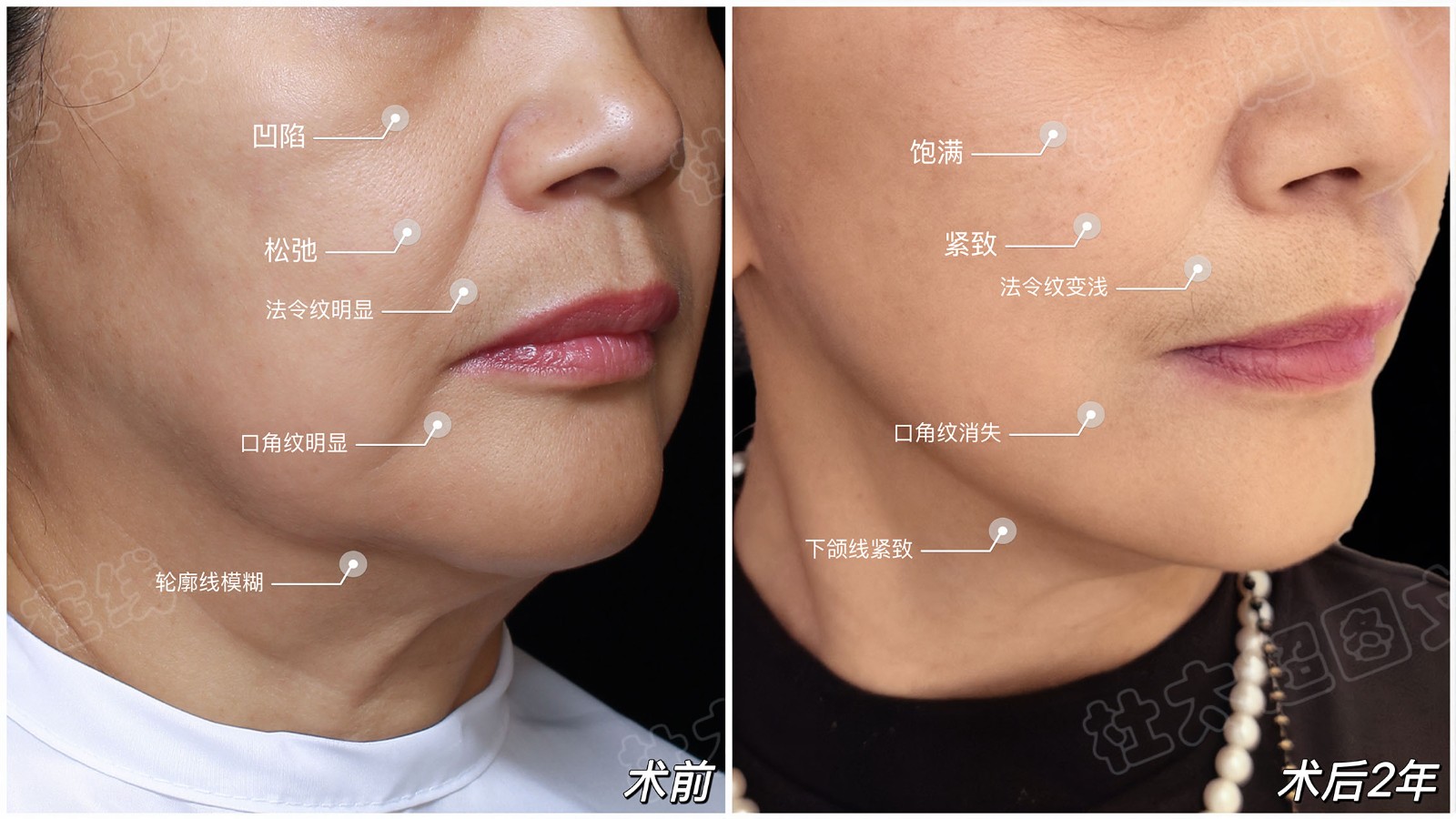 60+术前凹陷、松弛、纹路明显、轮廓模糊;caw多点小切口面部提升缩紧术后2年,面部饱满紧致,纹路淡化或消失,下颌线清晰,实现面部整体年...