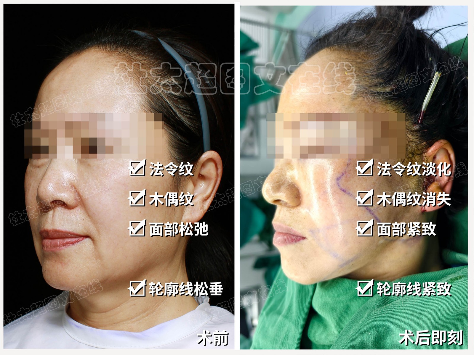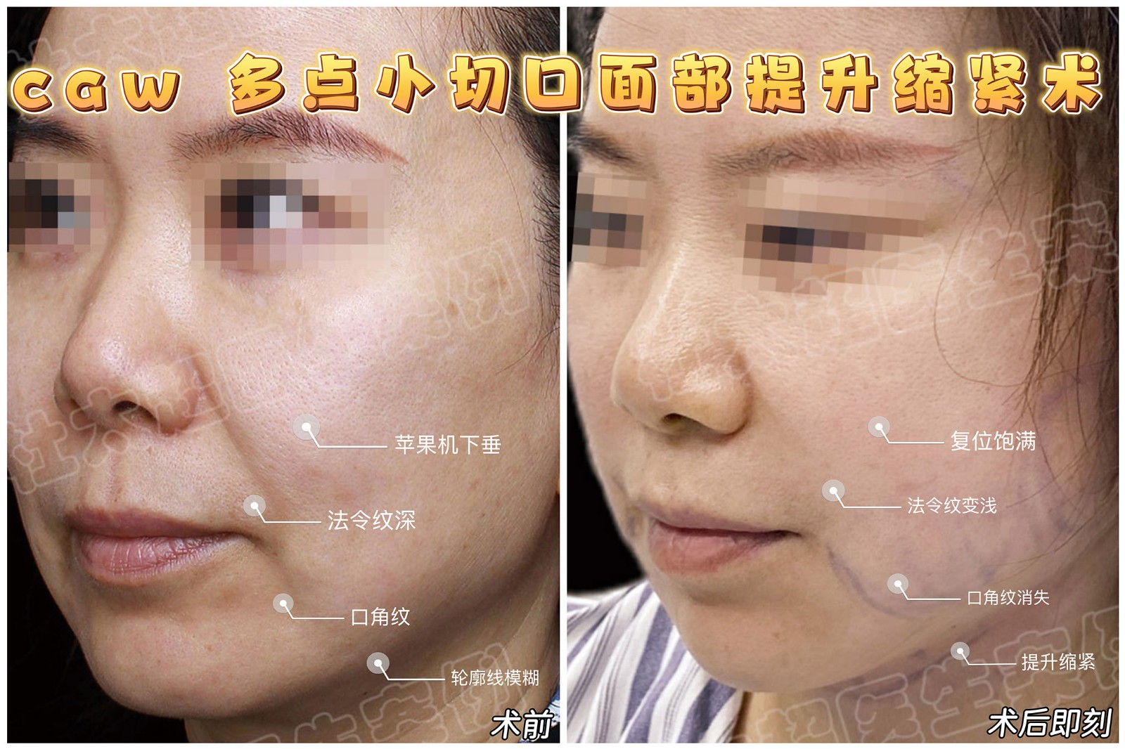 术前苹果肌下垂,法令纹明显,口角囊袋、口角纹路突出,轮廓线模糊;术后即刻虽有轻度肿胀,但法令纹明显淡化,口角问题基本消除,轮廓紧致...