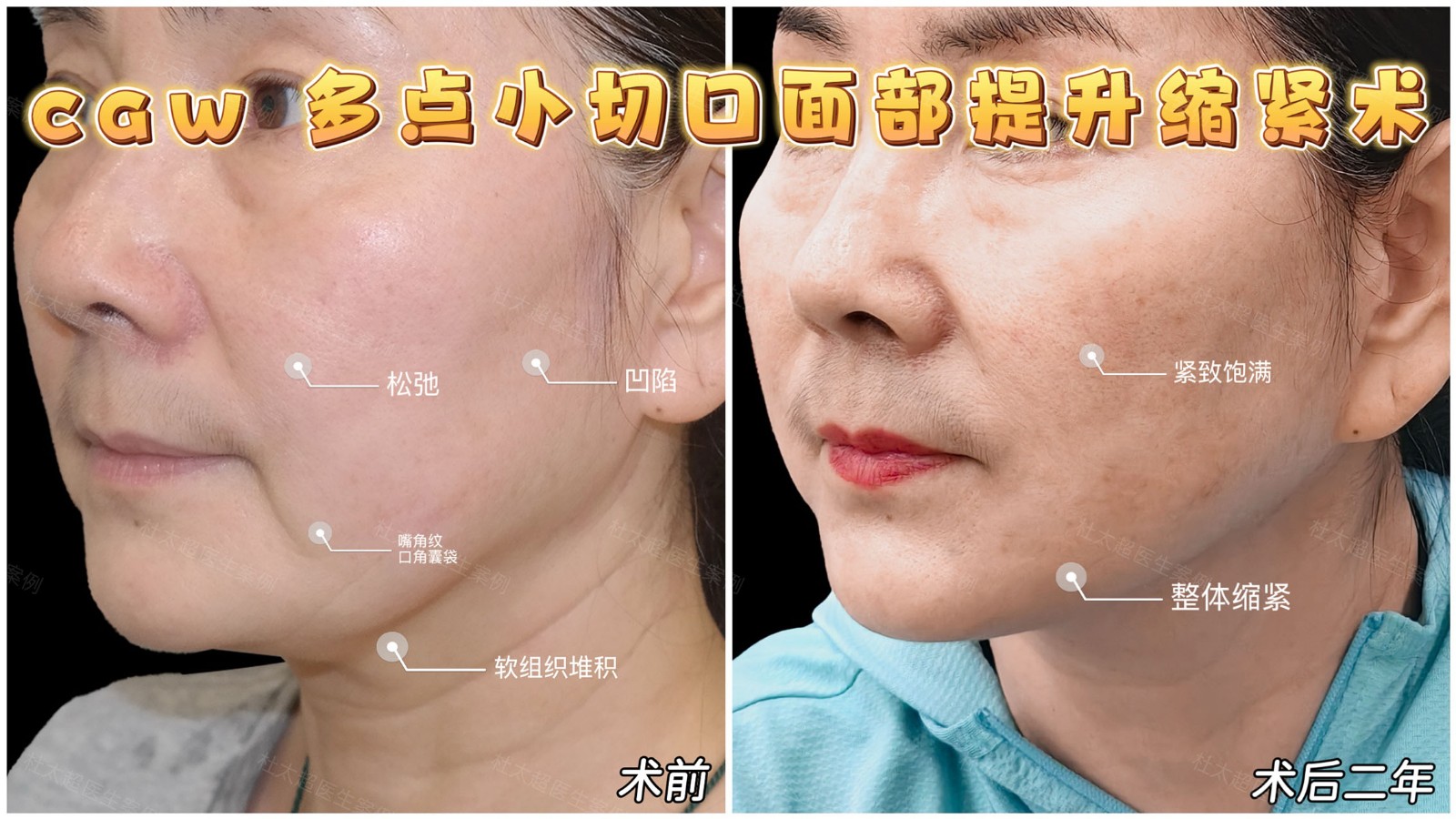 caw多点小切口面部提升缩紧术效果显著。术前面部有松弛、凹陷、纹路及软组织堆积问题,术后二年实现紧致饱满、轮廓缩紧,经长期验证,以微...
