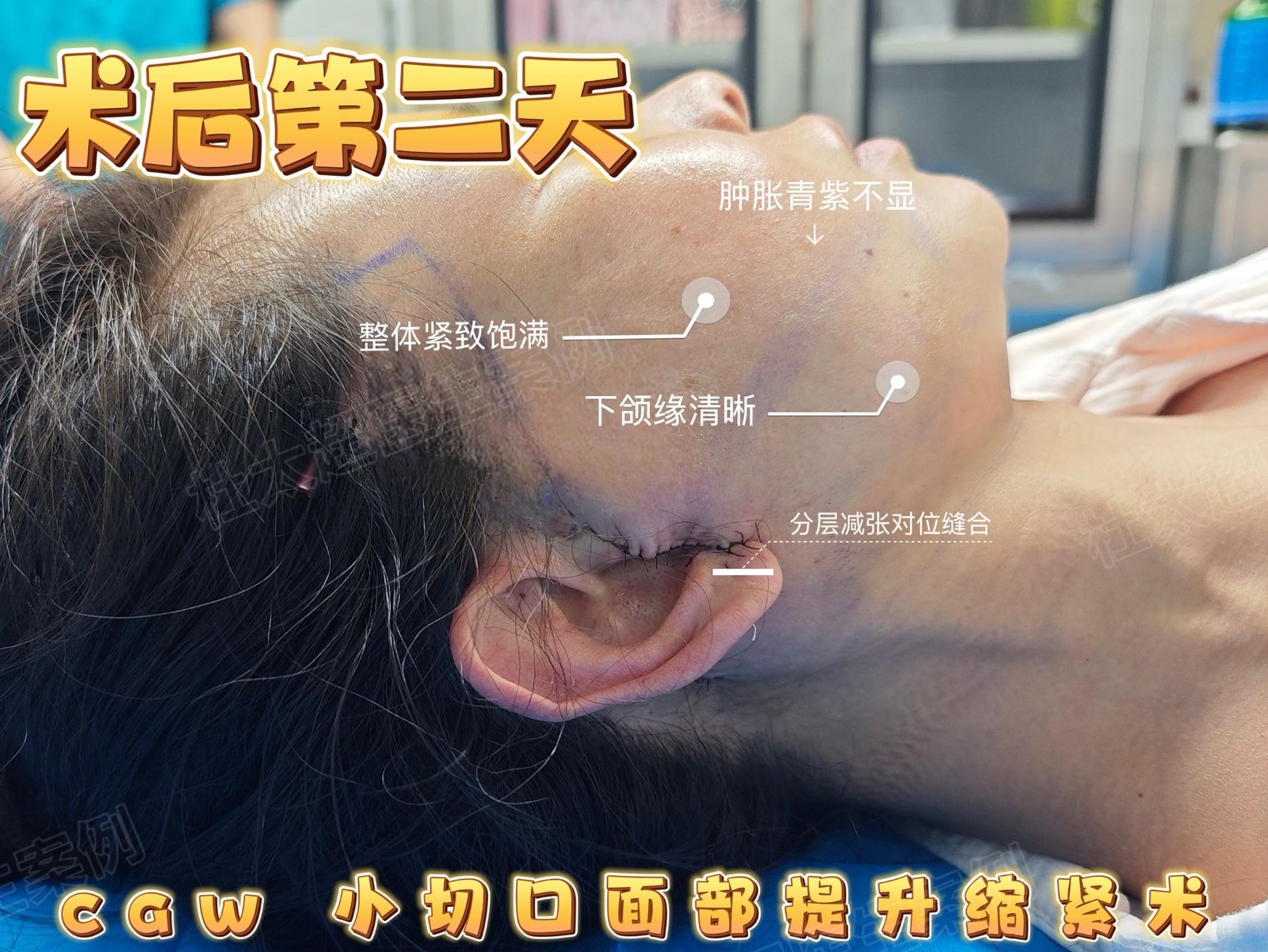 caw小切口面部提升缩紧术后 2 天反馈:无明显青紫肿胀,恢复速度超出预期中面部紧致度肉眼可见,下颌线轮廓清晰创口隐蔽,日常活动不受限...