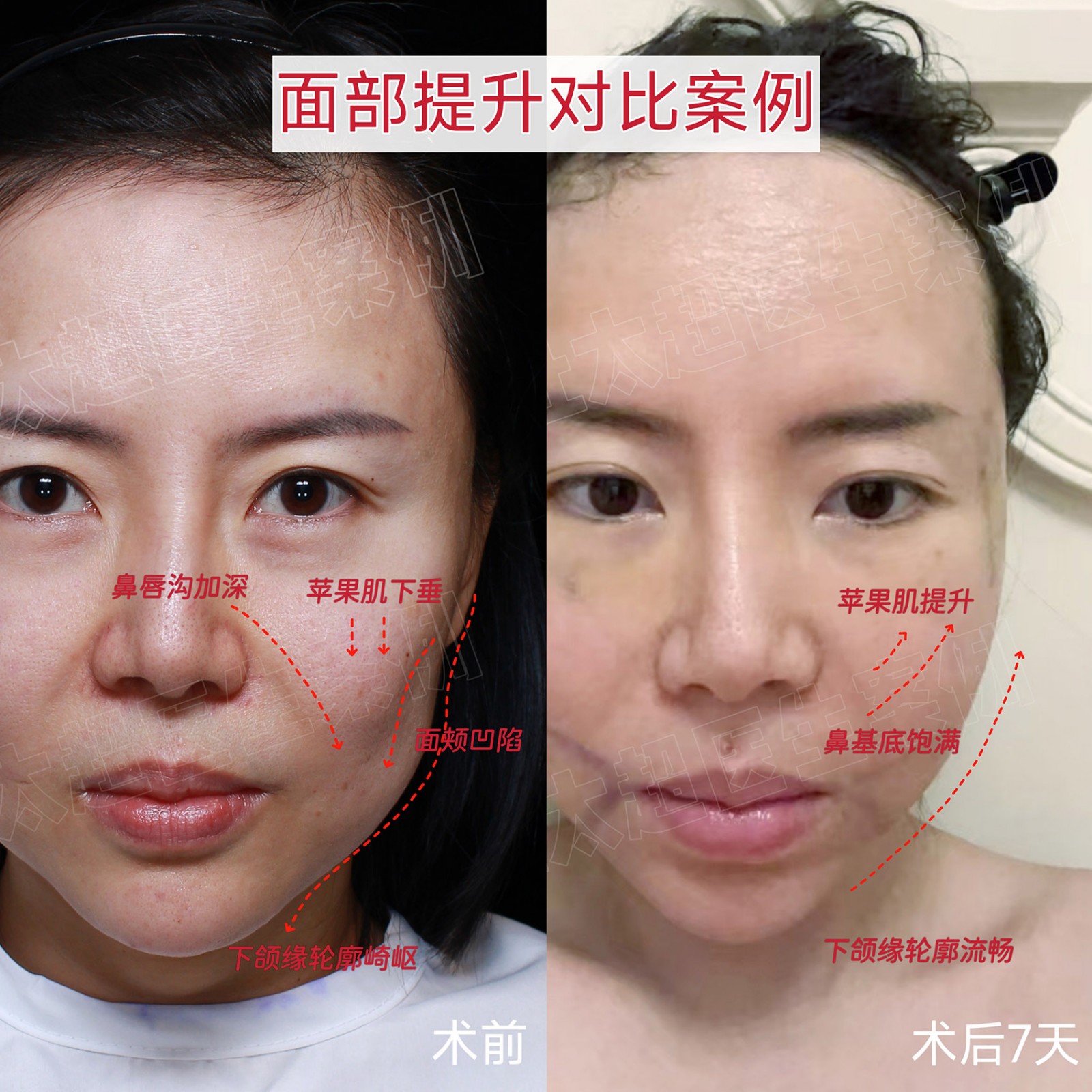 #面部提升幼态脸打造对比中面部年轻化——复位苹果肌高光点,饱满面颊部口周年轻化鼻基底淡化,改善法令纹重塑轮廓线,提升下垂组织改善发....