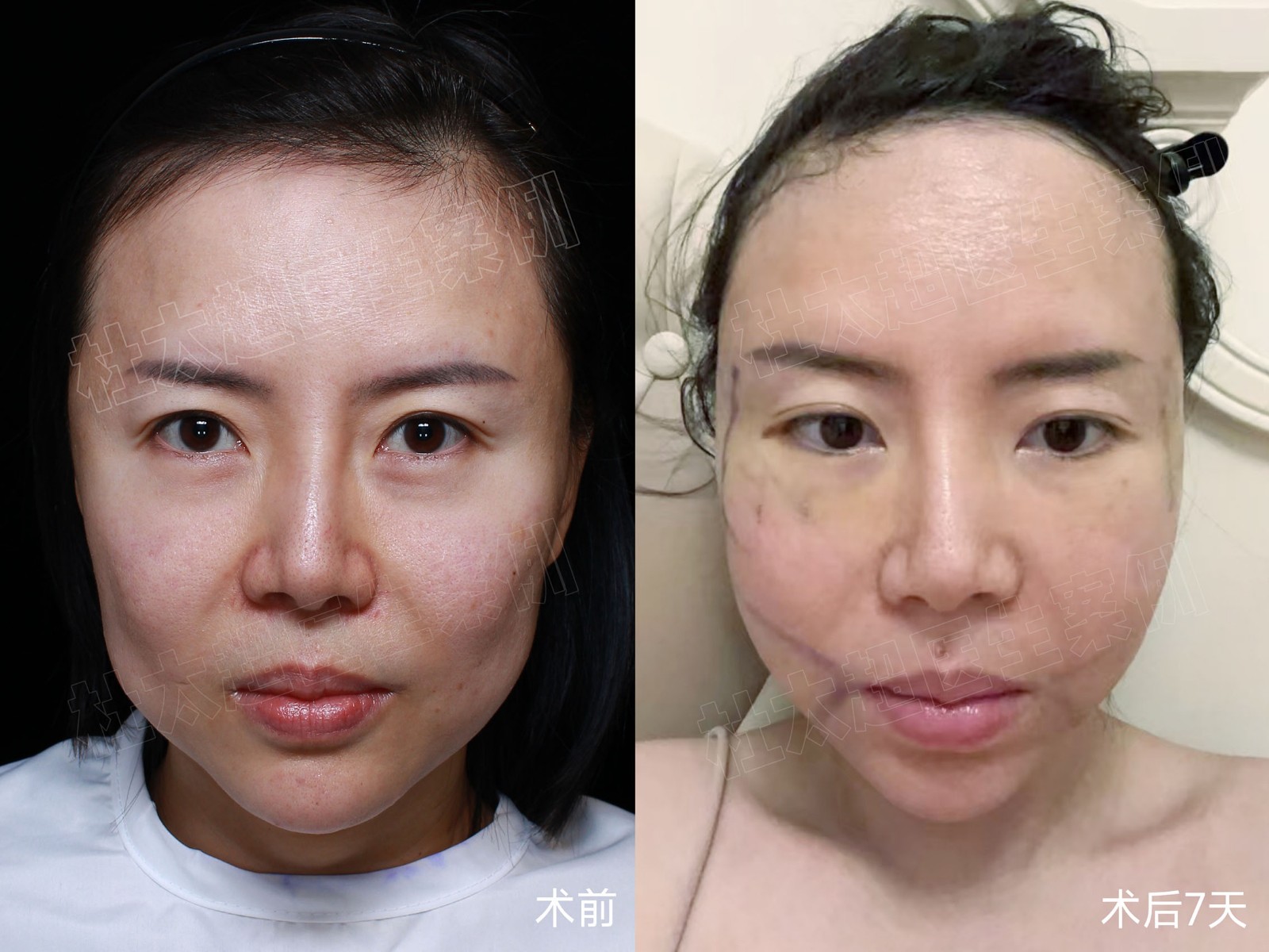 求美者35岁,面部松弛下垂、面颊凹陷、苹果肌移位、法令纹加深,通过拉皮手术+钻石精雕进行组织复位和缩紧后,术后7天效果如图